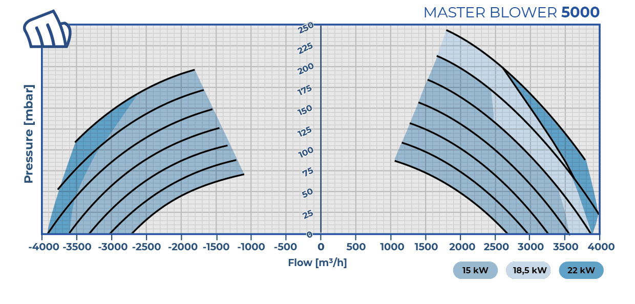 Een turboblower, zoals de Master Blower serie, werkt volgens een high-speed principe waarbij met zeer hoge toerentallen efficiënt lucht wordt verplaatst. Hierdoor kan bij vergelijkbare luchtprestaties vaak met een lager motorvermogen worden gewerkt dan bij conventionele blowers of zijkanaalventilatoren.